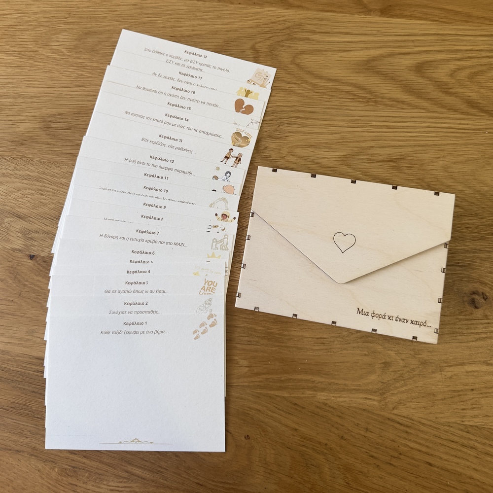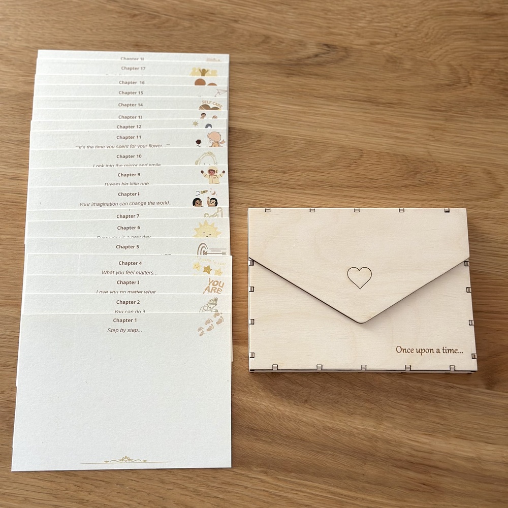 Οι κάρτες φυλάσσονται σε premium ξύλινο κουτί με προσεγμένο φινίρισμα και προστατευτικό plexiglass στο επάνω μέρος, σχεδιασμένο να αντέχει στον χρόνο. Όταν συμπληρωθεί και η τελευταία κάρτα, το κουτί μετατρέπεται σε ένα ανεπανάληπτο δώρο που παραδίδεται στο παιδί στα 18 του. Μια κληρονομιά λέξεων, στιγμών και αγάπης.