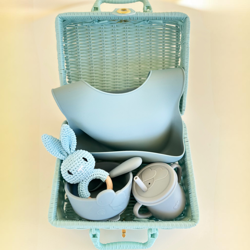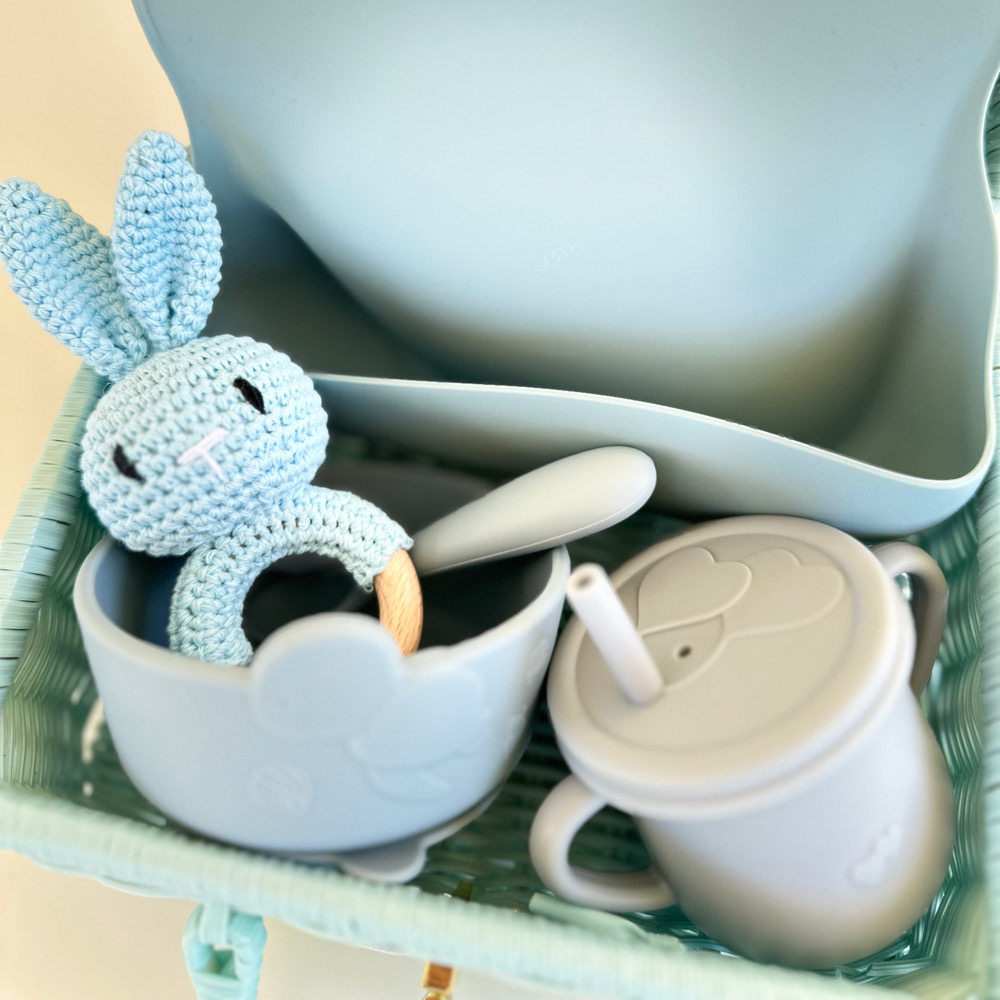 -1 σετ φαγητού από σιλικόνη :σαλιάρα, εκπαιδετυικό ποτηράκι με δύο στόμια, μπολ φαγητού και κουταλάκι